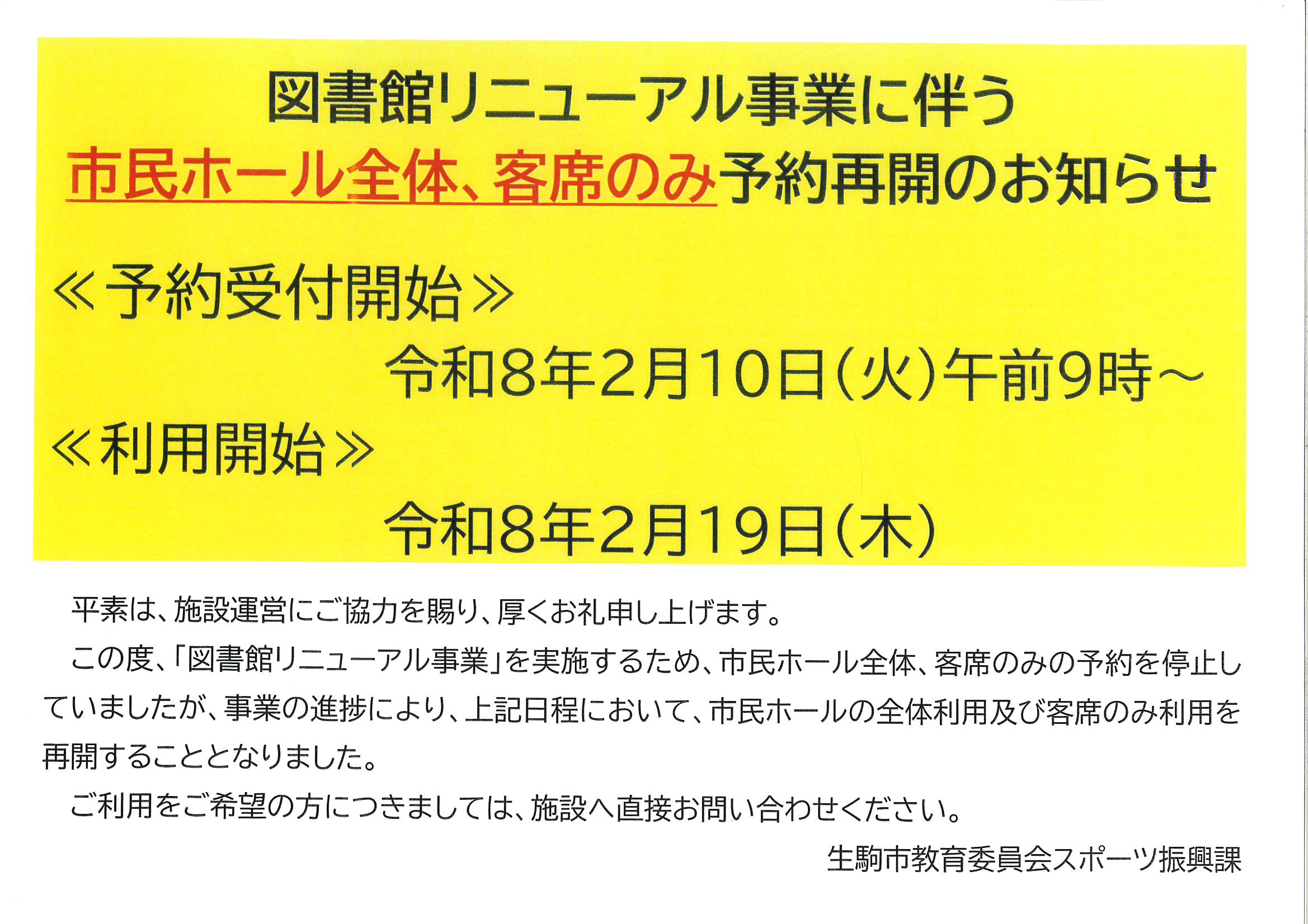 「図書館リニューアル事業」を実施するため、市民ホール全体、客席のみの予約を停止していましたが、